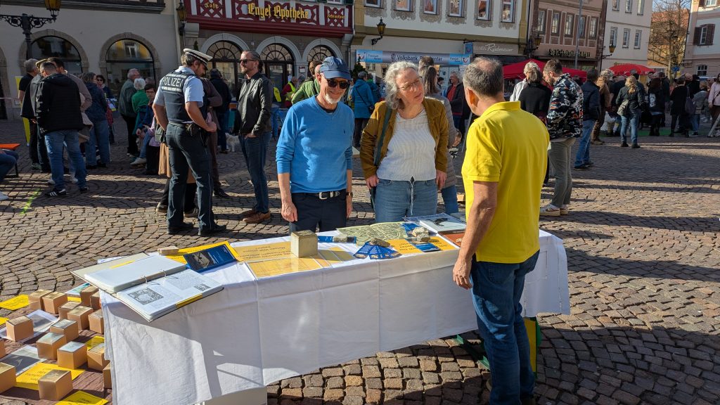 Im Laufe des Nachmittags fanden sich an unserem Tisch viele interessierte Besucher ein, denen wir unsere Arbeit vorstellen oder mit denen wir in Erfahrungsaustausch treten durften. Es ist schön zu wissen, dass unser Tun wertgeschätzt wird, denn sehr häufig hörten wir an diesem Tag, dass alles getan werden muss, um dem Vergessen entgegenzuwirken.