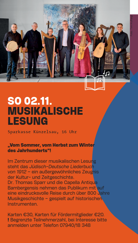 Am 2. November um 16 Uhr findet in der Sparkasse in Künzelsau im Rahmen unserer Initiative DemHOKratie die musikalische Lesung „Vom Sommer, vom Herbst zum Winter des Jahrhunderts“ statt. Sie stellt ein jüdisch-deutsches Liederbuch von 1912 in den Mittelpunkt. Ausführende sind Dr. Thomas Sparr und die Capella Antiqua Bambergensis.